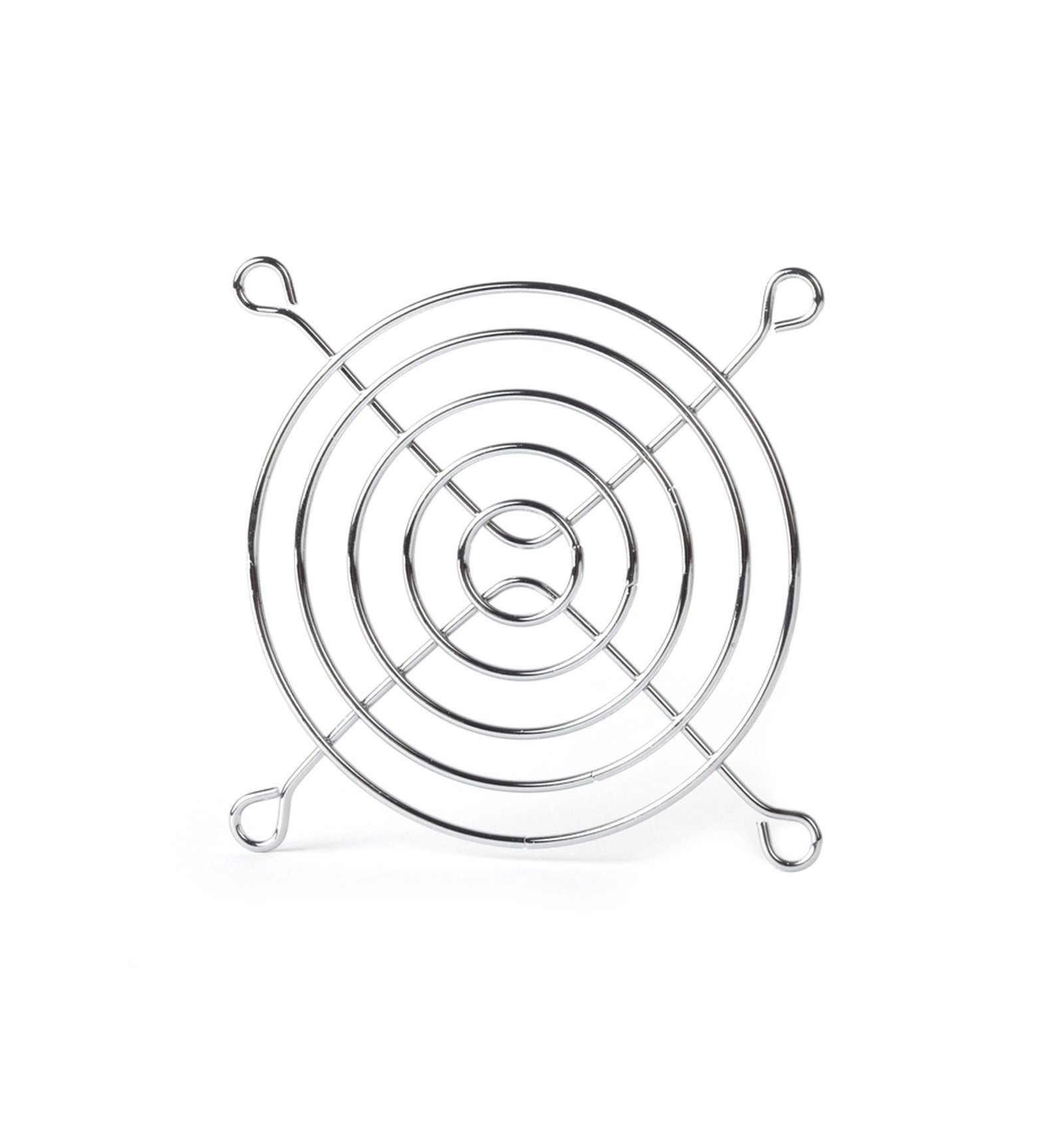 The metal guard is constructed of C1008 Steel with a nickel-chrome finish. It has four holes that can be screwed onto any cooling fan with an 80-millimetre square frame. Able to withstand 220 pounds of pull force at each joint, the guard was designed to withstand heavy usage.