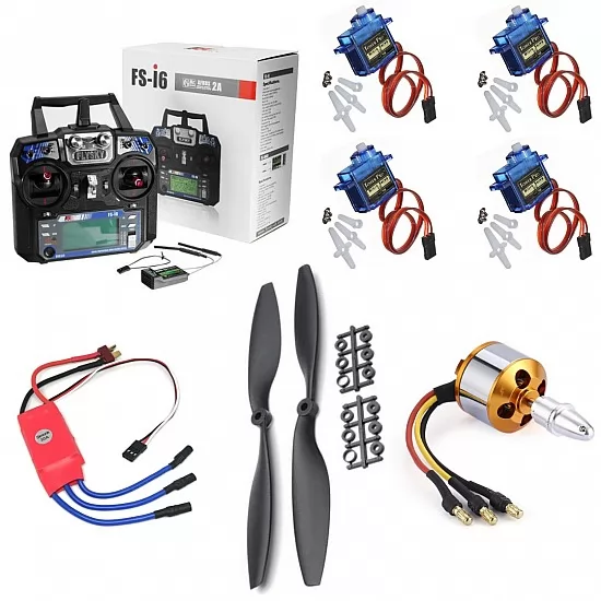 This RC Aeroplane Kit includes almost all parts for the basic RC Aeroplane with 6ch RX TX. It includes everything to make and fly your own RC Aeroplane. This Kit Provides a FlySky FS-i6 RC Transmitter with Receiver,1000kv Brushless motor,30A Simonk ESC, TowerPro SG90 Servo Motor, and a 1045 Propeller pair(CW+CCW).